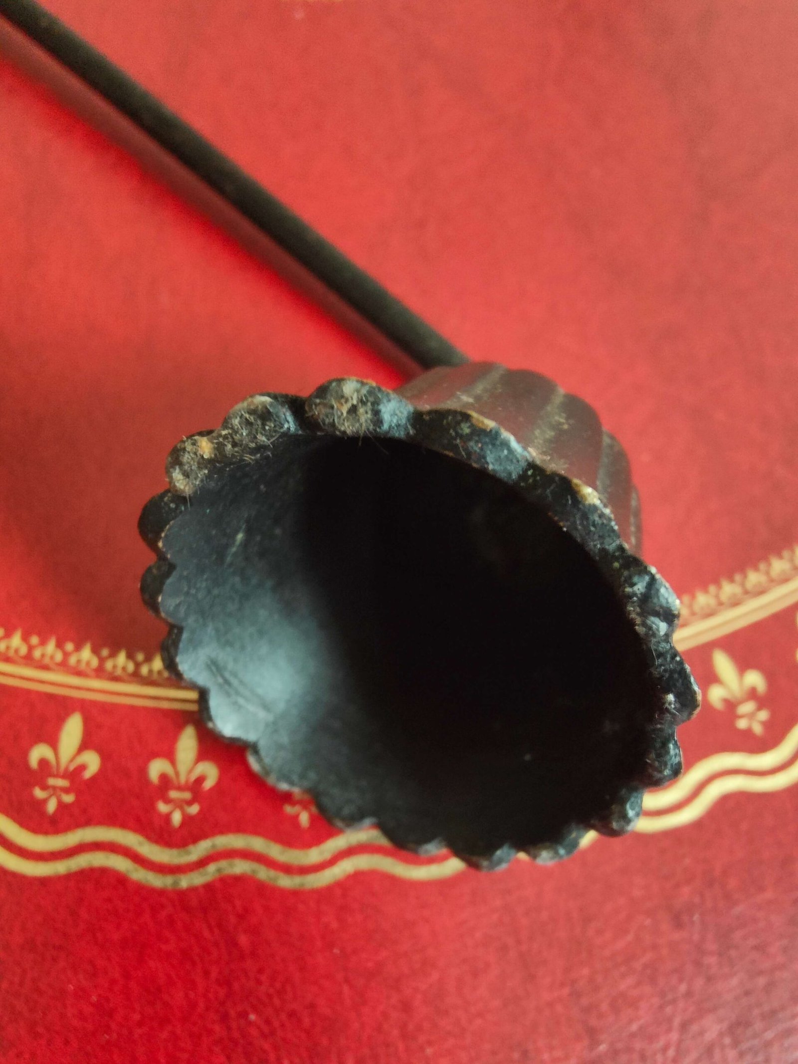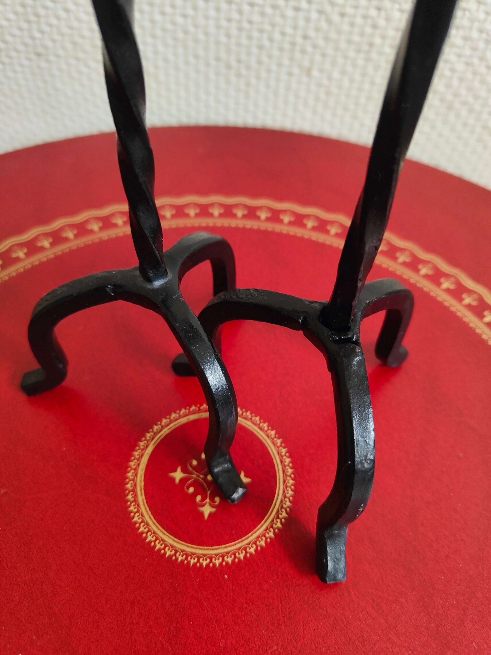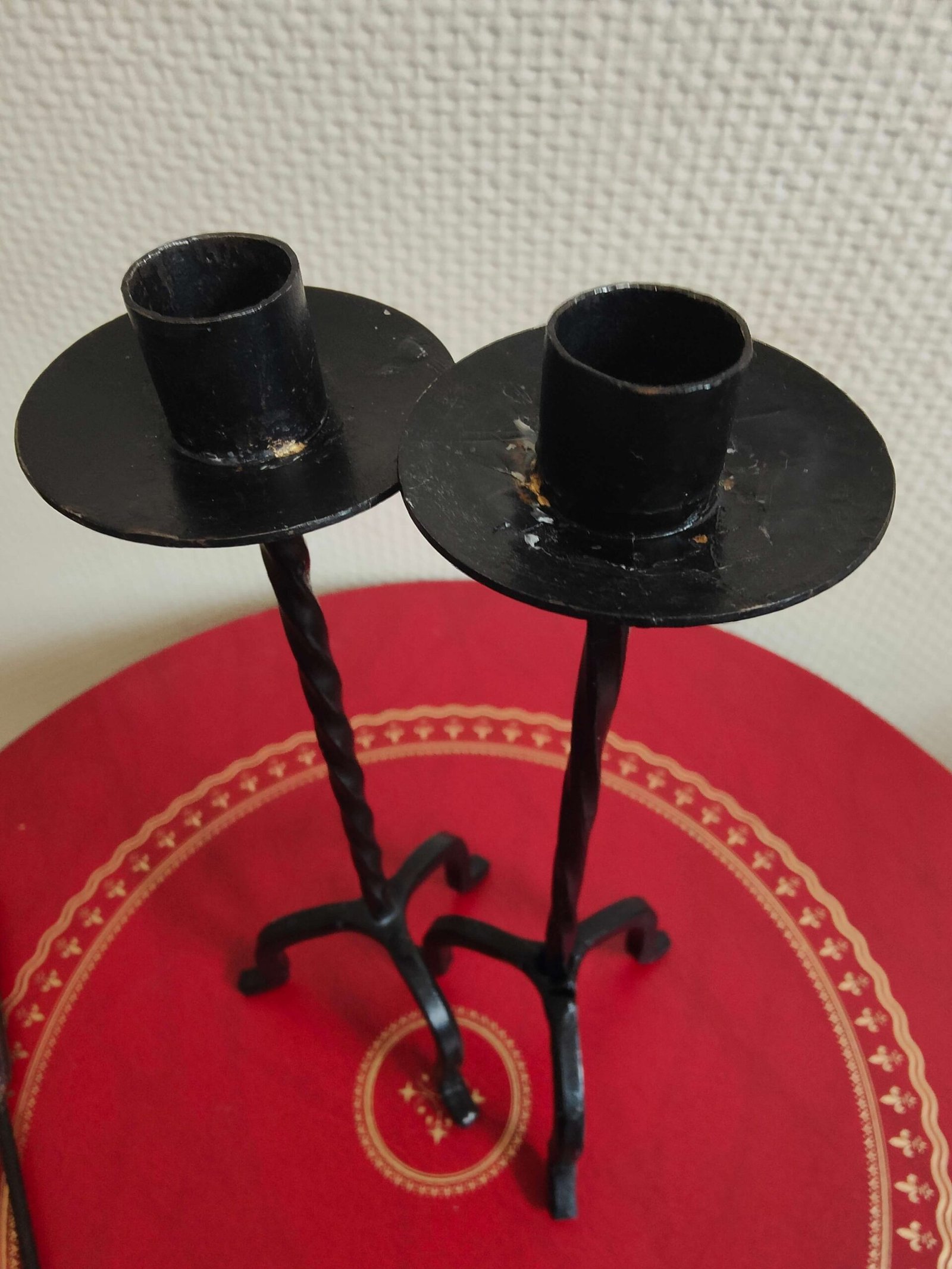 Ces bougeoirs torsadés en métal avec éteignoir assorti sont des objets de seconde main, avec quelques imperfections liées à un premier usage, ce qui participe à leur charme.