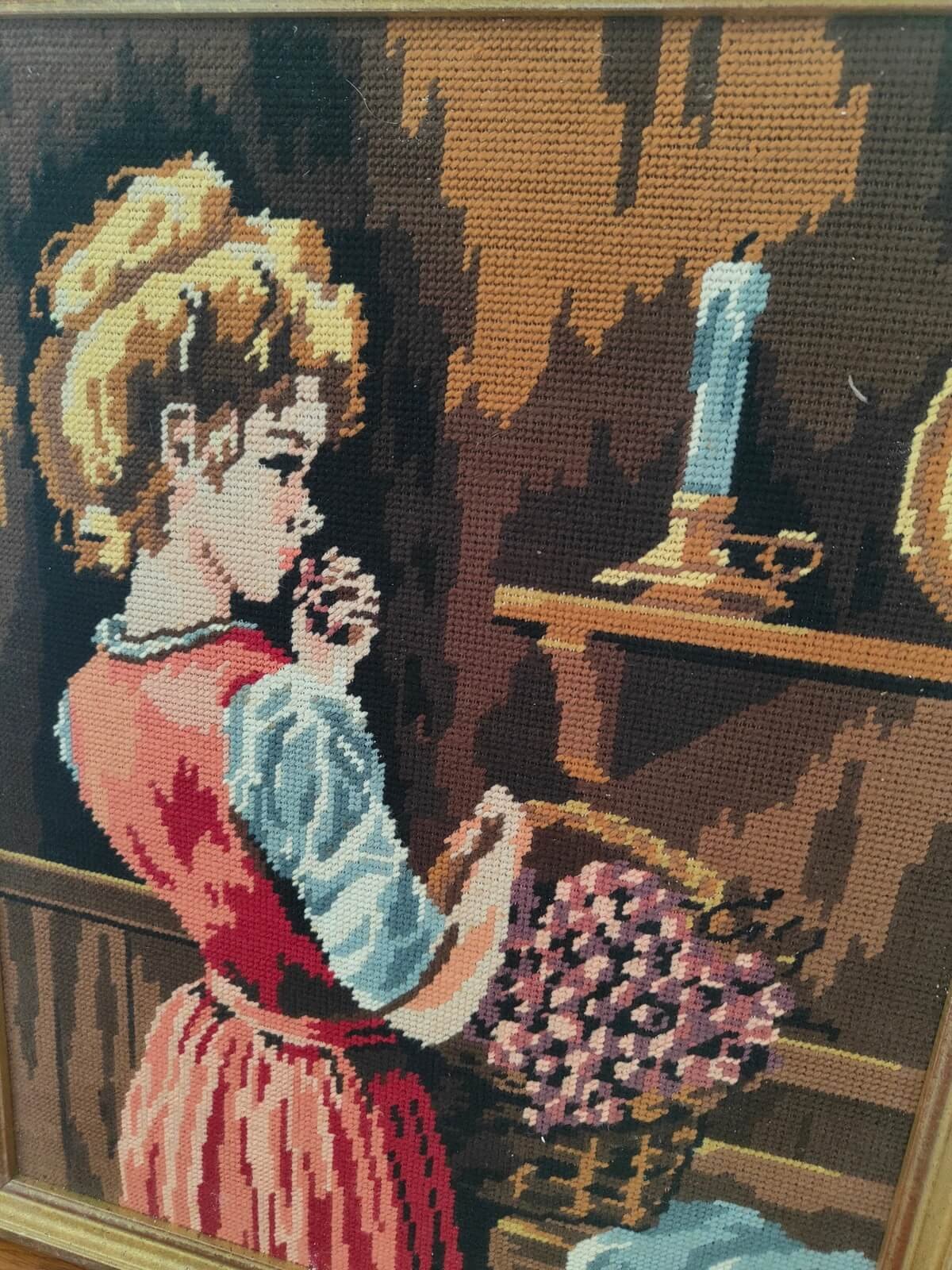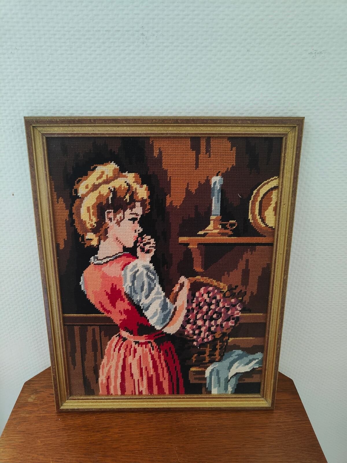 Ce canevas vintage encadré représentant une femme au panier de fleurs est une véritable pièce de brocante en ligne, pleine de caractère et d’histoire.
