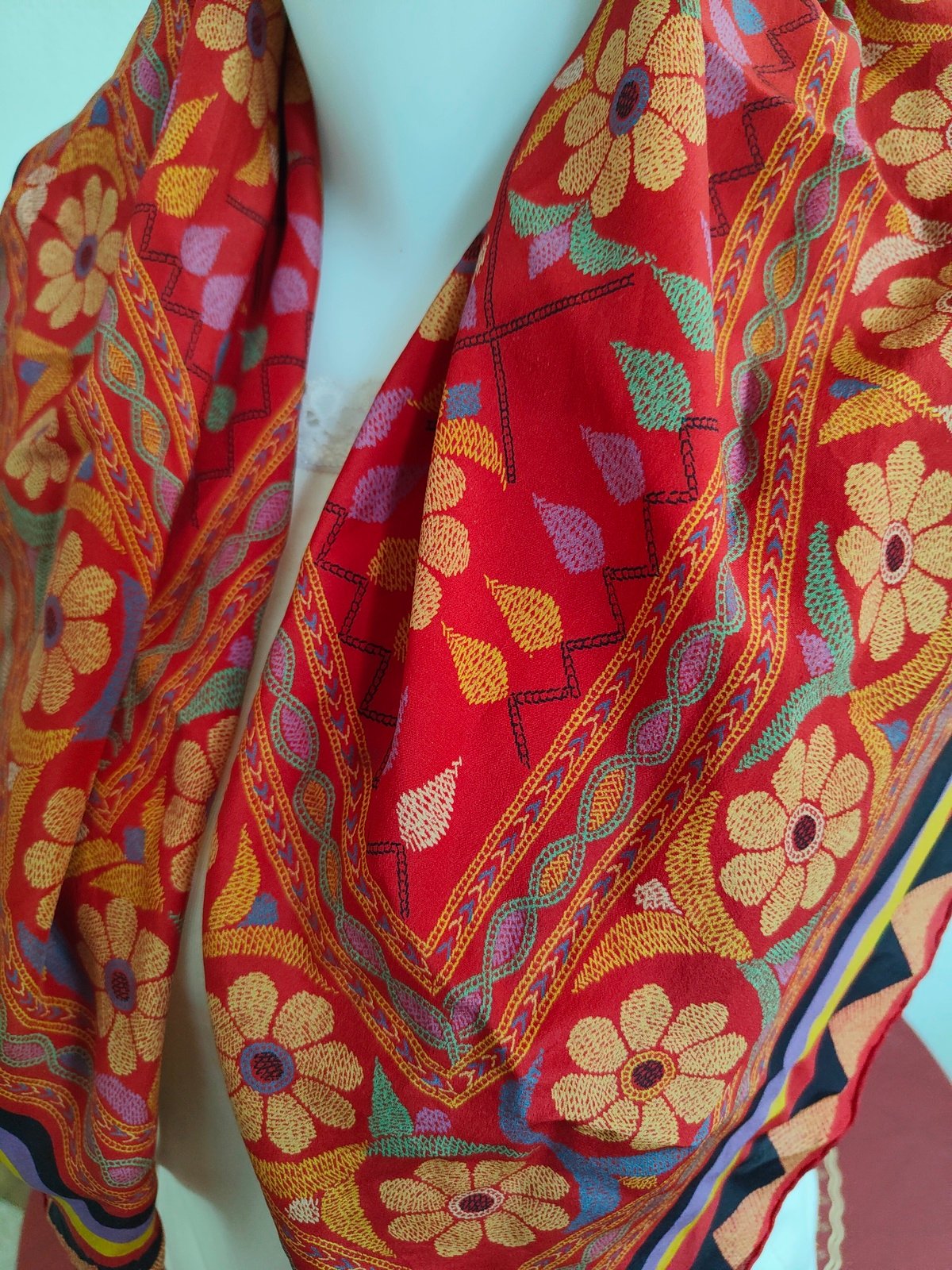 Son fond rouge profond, sublimé par des motifs floraux multicolores, attire immédiatement le regard tout en restant élégant et facile à porter.