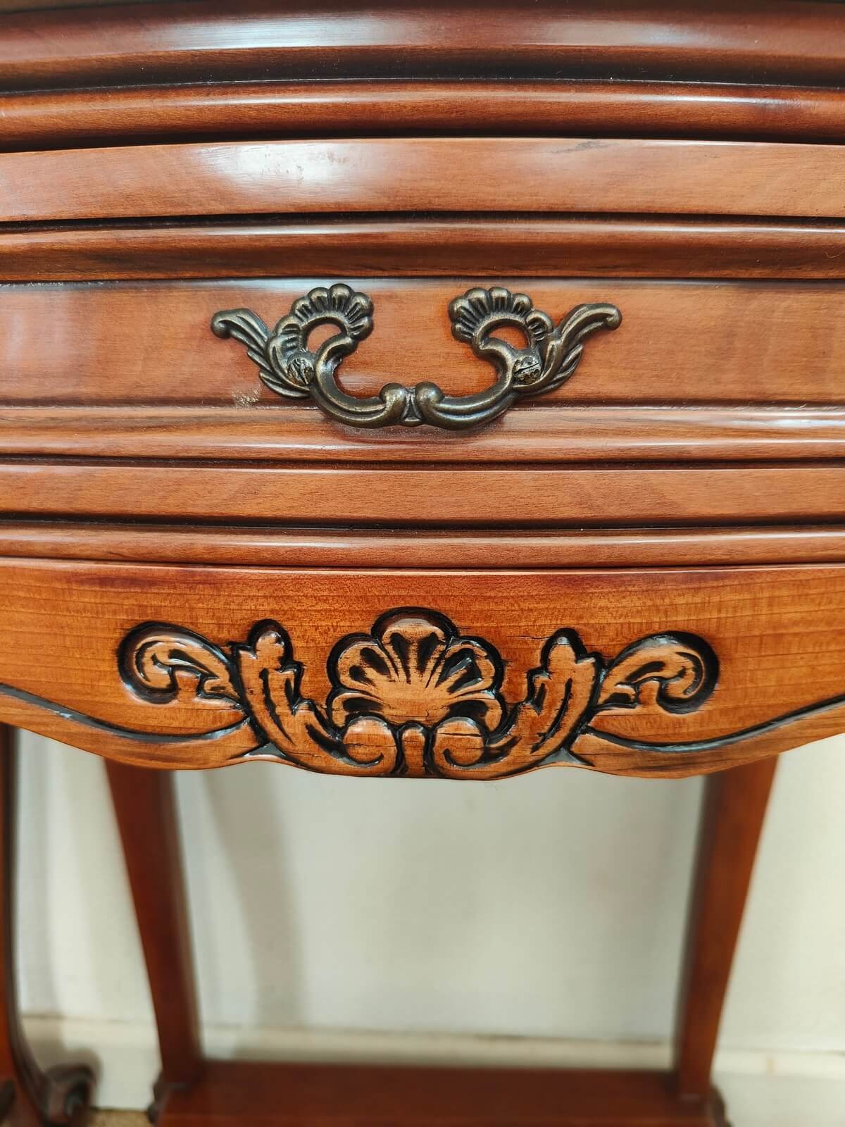 Les pieds galbés et les moulures délicates témoignent d’un vrai souci du détail, tandis que la poignée en métal finement travaillée ajoute une touche discrète et raffinée. Chaque pièce reste unique, avec le charme authentique de la seconde main.
