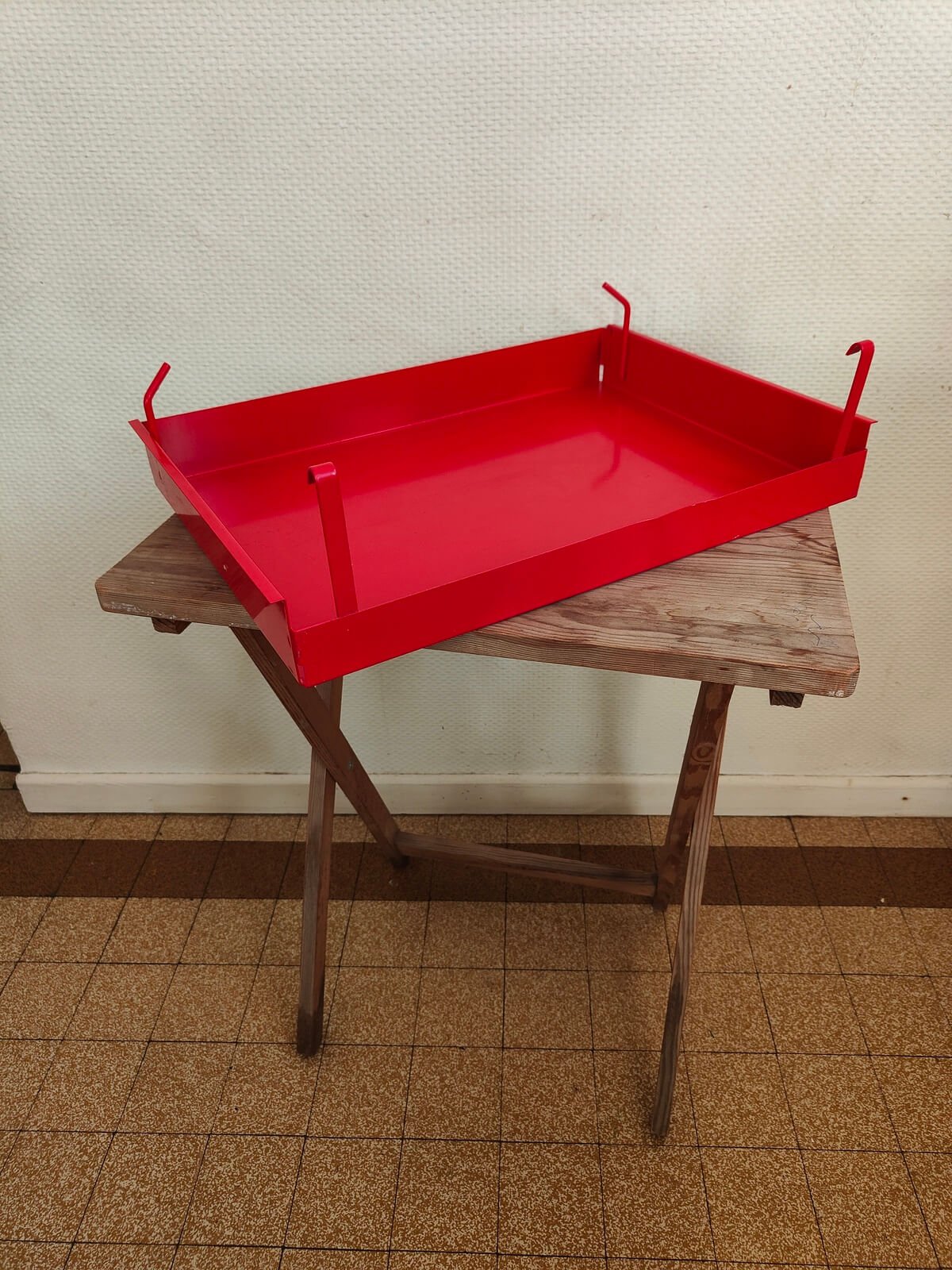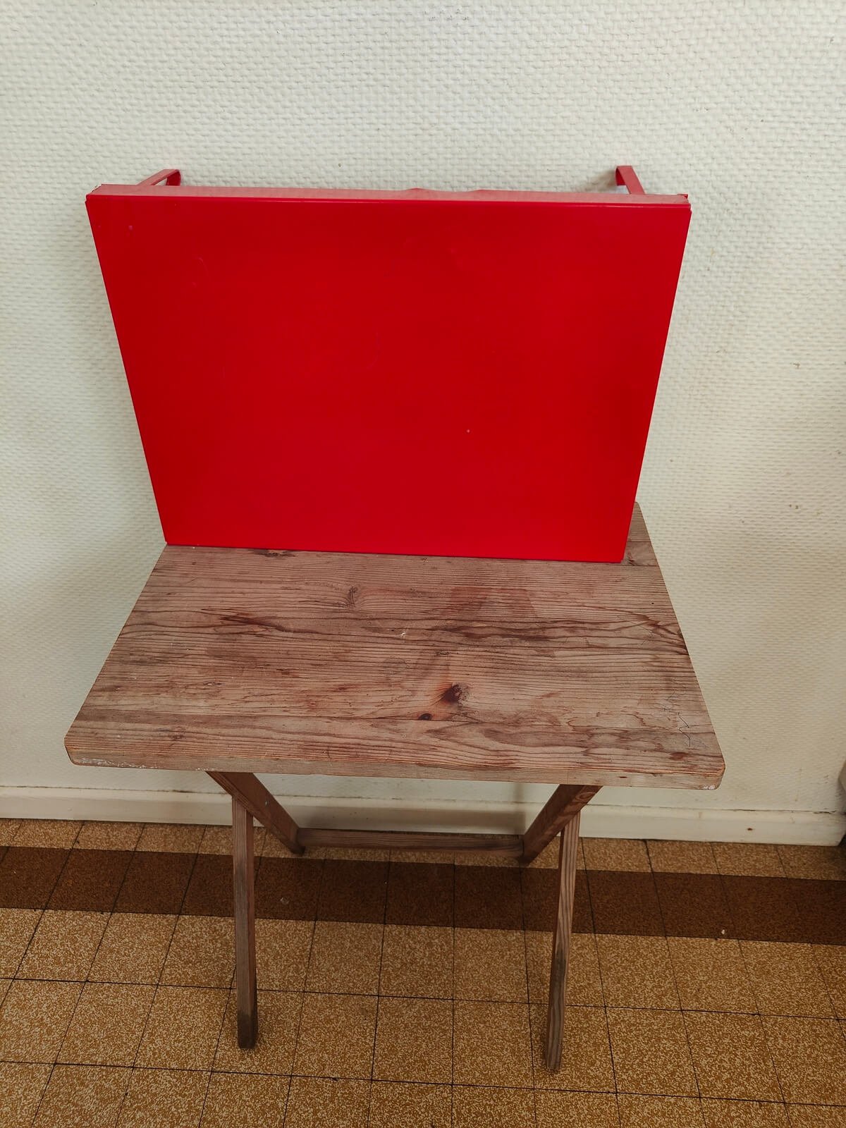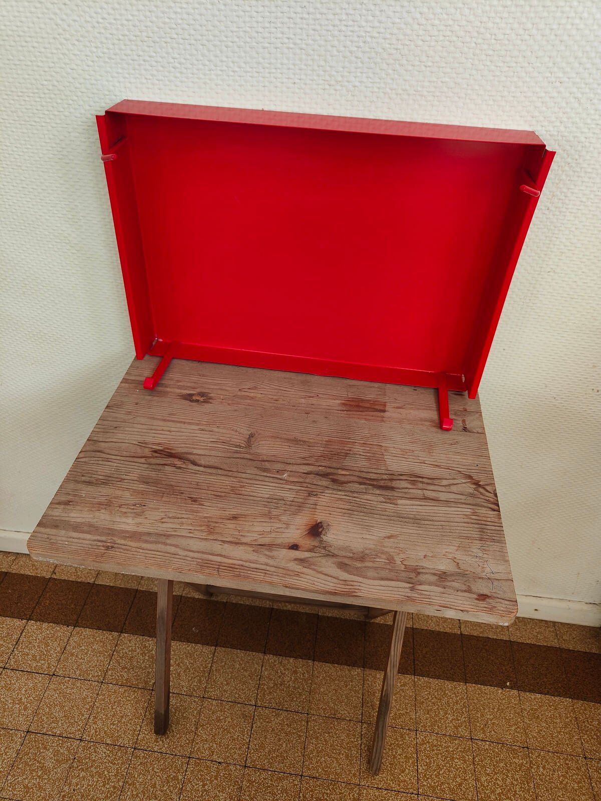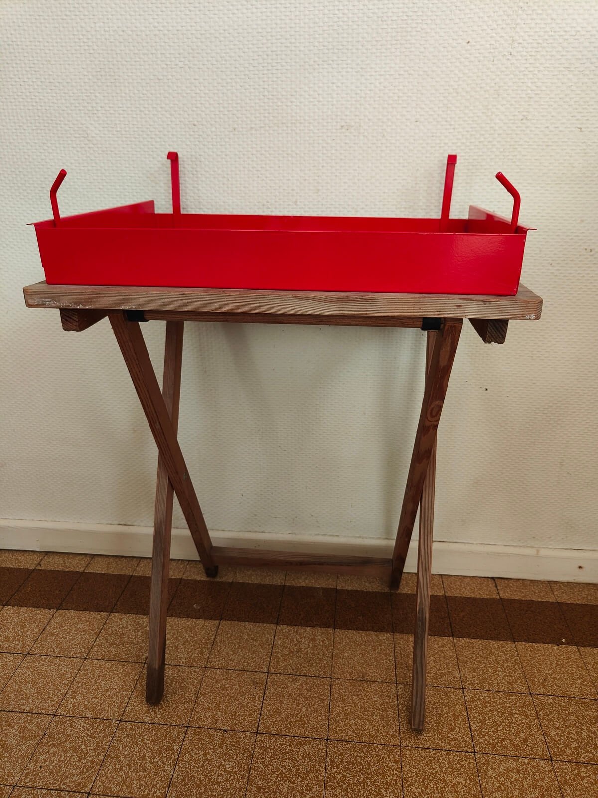 Cette petite console pliable en bois et plateau métal rouge vintage est un véritable objet de brocante en ligne, idéal pour les amateurs de décoration vintage et industrielle. Compacte et légère, elle se glisse facilement dans tous les espaces et apporte une touche graphique grâce à son plateau rouge vif.